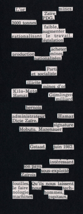 The starting point for this project was the discovery of an article about my grandfather, Hans Mazenauer, written in 1982 in the Swiss newspaper “24 heures”. It recounts his intention to search for gold in the former Republic of Zaïre (the Democratic Republic of the Congo, DRC) and his relationship with President Mobutu Sese Seko. The commodification of gold can be seen doubly in the symbolic mountainous areas of Switzerland. On one hand, in an implicit way in the forts dug into the rock. On the other hand, and more explicitly, through the ruins of the Gondo gold mines which went bankrupt in 1897. Paradoxically, the gold kept and preserved on the Swiss territory is extracted from mines in the DRC. I aimed to connect these spatially distant lands; those mining in the DRC and conservation in Switzerland. The story of Hans Mazenauer attempts to challenge the image of a neutral Switzerland and allows me to put his direct involvement in gold mining into perspective.